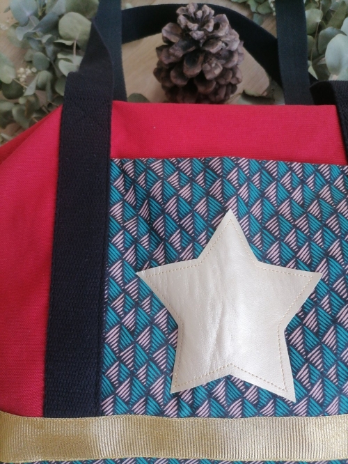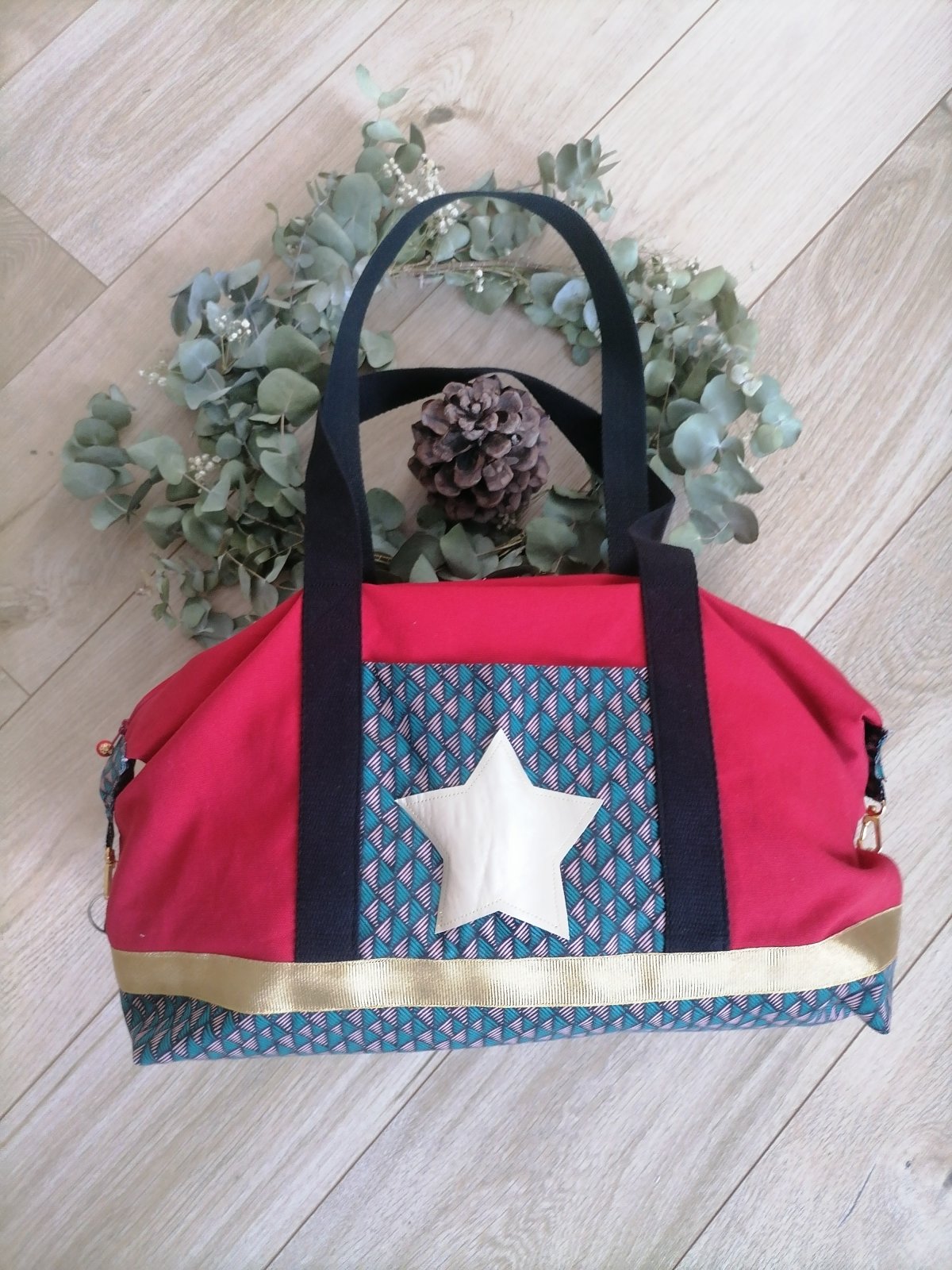 Grand sac de sport en gabardine rouge et imprimé géométrique vert : grande poche extérieure avec une étoile en simili cuir, 2 poches intérieures, fermeture en zip,
