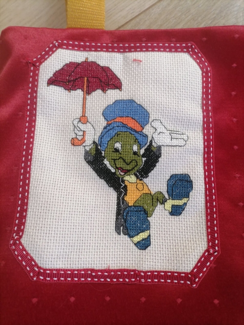 Pour une enseignante, fan de Pinnocchio et de son fidèle ami Giminy Criquet, voici un Tote bag brodé à leurs effigies. De grand volume, il peut contenir plusieurs livres ou classeurs de cours ! Cousu dans un très beau tissu jacquard rouge coquelicot et entièrement doublé, il peut vivre jusqu'à 4 années d'utilisation intensive !