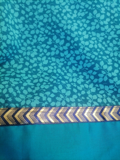 Tote bag cousu dans un coton liberty imprimé feuilles vert clair sur un fond vert canard ! Il est doublé dans un coton vert canard, un ruban bleu strié de traits dorés donne une touche d'élégance supplémentaire.